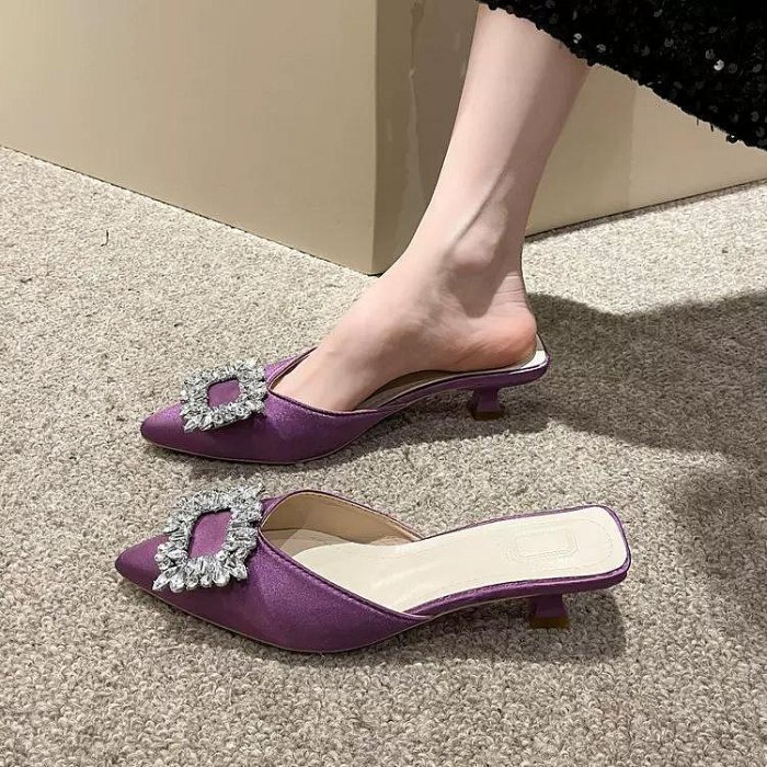 優寶購物《ubao.Tw》特貨品商城,黑貓宅配,取貨付款,歐美尖頭水鑽方扣鏤空銀色方扣前包後空低跟鞋3公分涼鞋拖鞋低跟鞋綢緞緞面 3色 | Yahoo拍賣