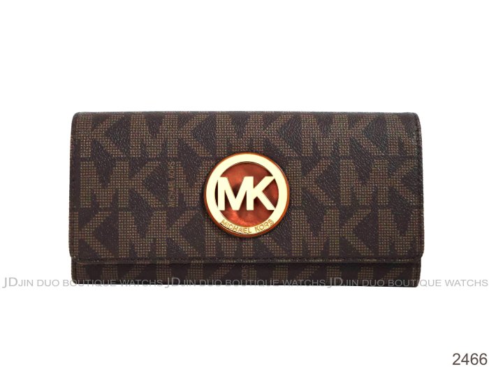 優寶購物《ubao.Tw》特貨品商城,黑貓宅配,取貨付款,金鐸精品~2466 MICHAEL KORS MK 深咖啡色字紋PVC金屬LOGO掀蓋長夾 全新品 | Yahoo拍賣