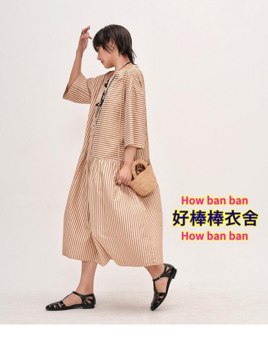 優寶購物《ubao.Tw》特貨品商城,黑貓宅配,取貨付款,好棒棒衣舍_春夏不對稱條紋併接圓領寬鬆連身裙_輕熟典雅簡約 | Yahoo拍賣
