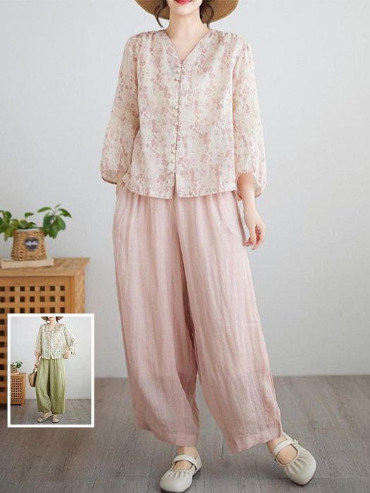 優寶購物《ubao.Tw》特貨品商城,黑貓宅配,取貨付款,文藝時尚套裝減齡印花七分袖襯衫松緊腰九分闊腿褲休閑薄款兩件套 | Yahoo拍賣