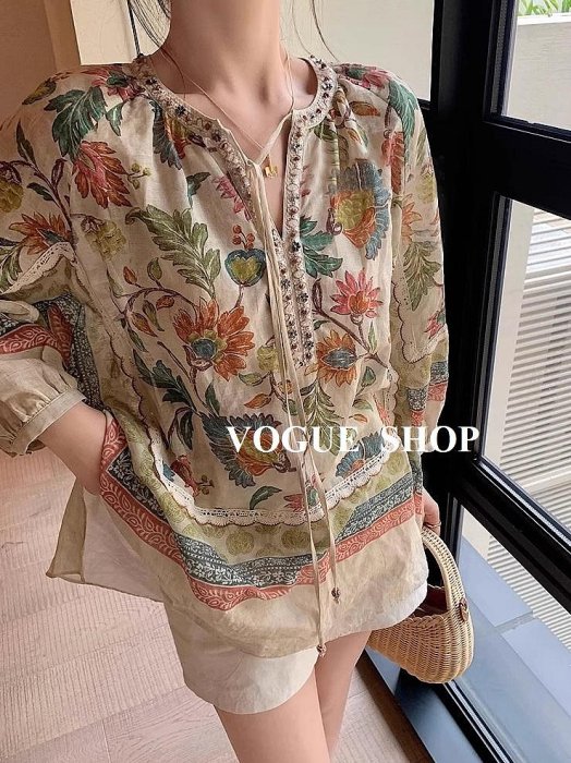 優寶購物《ubao.Tw》特貨品商城,黑貓宅配,取貨付款,波西米亞度假風棉麻印花小釘珠圓領寬袖上衣~預購 S~XL SIZE | Yahoo拍賣
