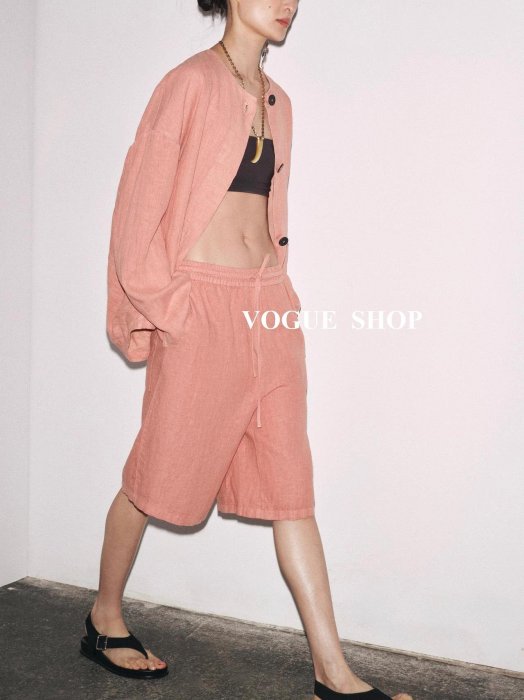 優寶購物《ubao.Tw》特貨品商城,黑貓宅配,取貨付款,西班牙早秋粉橘圓領亞麻肌理外套+中褲兩件套~預購S~L SIZE | Yahoo拍賣