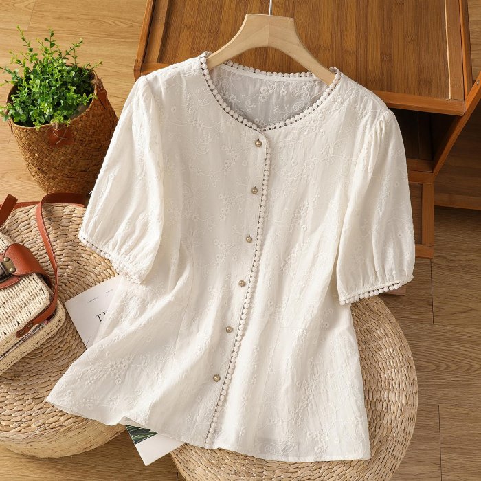 優寶購物《ubao.Tw》特貨品商城,黑貓宅配,取貨付款,重工刺繡純棉襯衫女短袖拼接花邊森系襯衣寬松棉麻上衣 | Yahoo拍賣