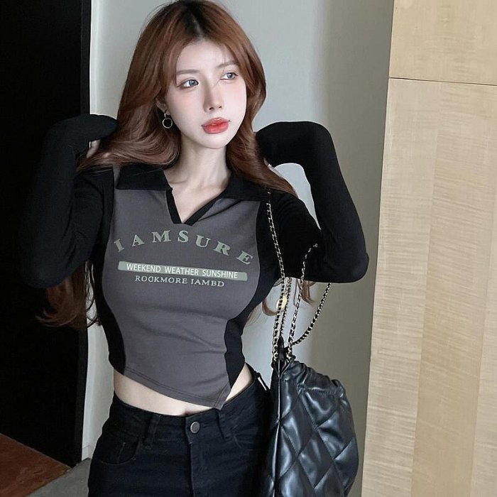 優寶購物《ubao.Tw》特貨品商城,黑貓宅配,取貨付款,POLO衫女長袖上衣長袖T恤春秋韓版新款撞色修身長袖T恤女V領短款上衣女上衣衣服休閒服裝流行女裝.AE17316.享樂趣.全館699免運 | Yahoo拍賣
