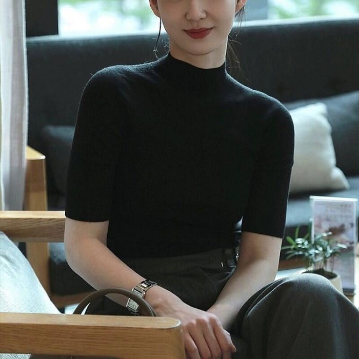 優寶購物《ubao.Tw》特貨品商城,黑貓宅配,取貨付款,【新款】夏季黑色半高領短袖針織衫女法式復古高級感薄款冰絲t恤修身上衣 | Yahoo拍賣