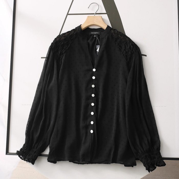 優寶購物《ubao.Tw》特貨品商城,黑貓宅配,取貨付款,=86號店=預購美國 輕薄紗織肌理感雪紡面料 有裡襯 V領剪裁 肩袖口收皺增加層次感 女上衣 如圖色 | Yahoo拍賣