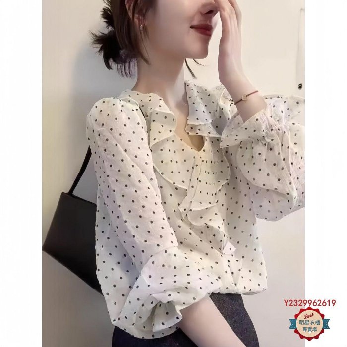 優寶購物《ubao.Tw》特貨品商城,黑貓宅配,取貨付款,明星衣櫃=法式優雅波點雪紡襯衫女2025早秋新款設計感V領氣質荷葉邊上衣潮 | Yahoo拍賣