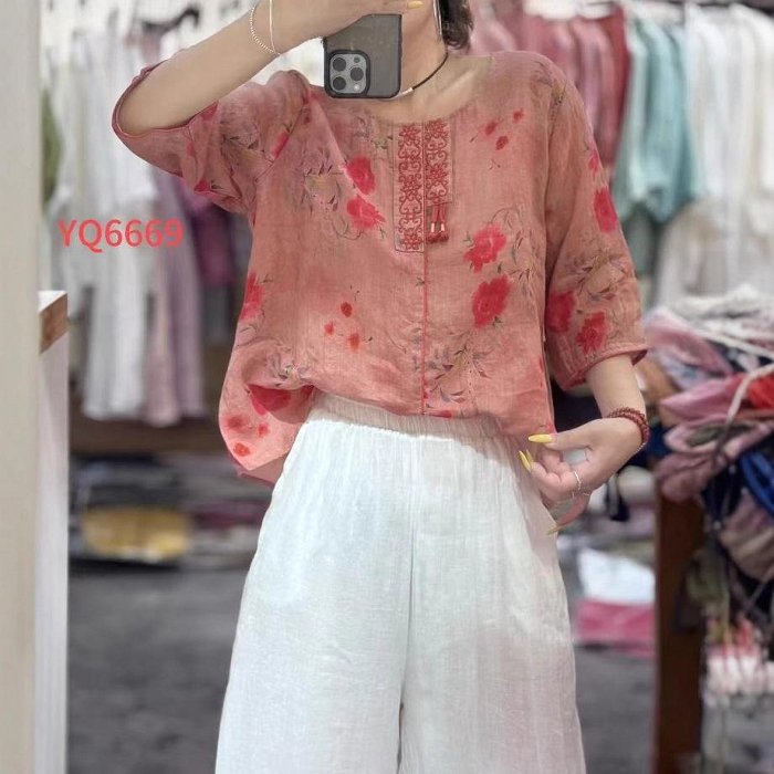 優寶購物《ubao.Tw》特貨品商城,黑貓宅配,取貨付款,新款上架夏季韓版寬松文藝復古苧麻印花圓領七分袖套頭襯衫百搭上衣女6669明星大牌同款服裝 | Yahoo拍賣