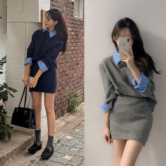 優寶購物《ubao.Tw》特貨品商城,黑貓宅配,取貨付款,【XX】女生學院風假兩件襯衫針織衫+A字短裙套裝 深藍 灰【10.08】Carrie Lee東大門-M16082 | Yahoo拍賣