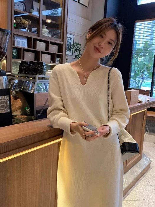 優寶購物《ubao.Tw》特貨品商城,黑貓宅配,取貨付款,法式v領針織連衣裙配大衣毛衣長袖洋裝 杏色 灰色 黑色 | Yahoo拍賣