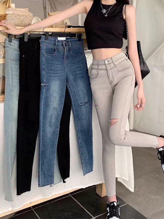 優寶購物《ubao.Tw》特貨品商城,黑貓宅配,取貨付款,好看米灰👍 高腰破洞緊身彈性九分褲 | Yahoo拍賣
