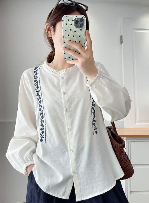 優寶購物《ubao.Tw》特貨品商城,黑貓宅配,取貨付款,女人衣櫥㊕秋裝上班族職場通勤約會美搭 白色/粉色/深藍色胸前對稱刺繡 花邊領排釦長袖臀長森林系上衣襯衫 大尺碼超大胸106-130.E533♥ | Yahoo拍賣