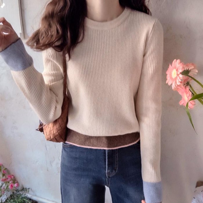 優寶購物《ubao.Tw》特貨品商城,黑貓宅配,取貨付款,E現貨水藍*4Bellee 正韓 時尚修身 撞色下擺羅紋長袖針織上衣 (3色) 【1022-63】 | Yahoo拍賣