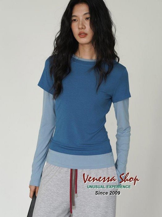 優寶購物《ubao.Tw》特貨品商城,黑貓宅配,取貨付款,小V私家~ 多巴胺撞色 MO 藍灰撞色假兩件 女の時尚感圓領T恤上衣 顯瘦百搭長袖拼接短袖上衣 2色 (G1798) | Yahoo拍賣