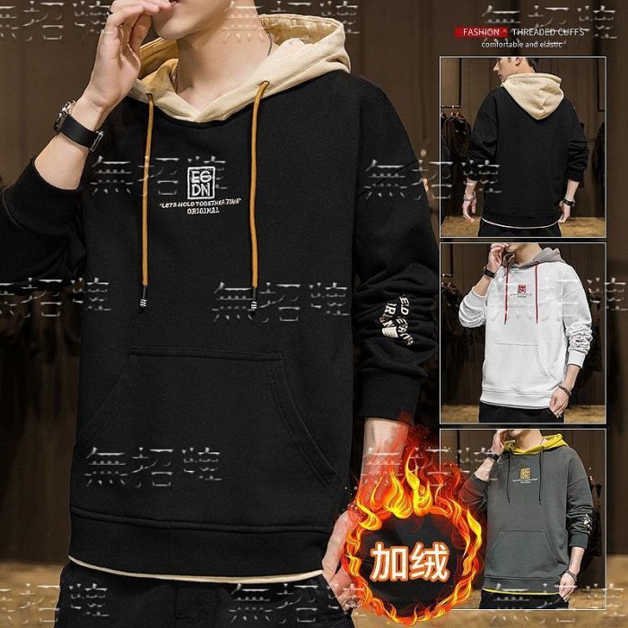 優寶購物《ubao.Tw》特貨品商城,黑貓宅配,取貨付款,無招牌廠家直銷店=假兩件衛衣連帽拼接外套男加絨加厚秋冬款仿刺繡印花學生韓版衛衣 | Yahoo拍賣