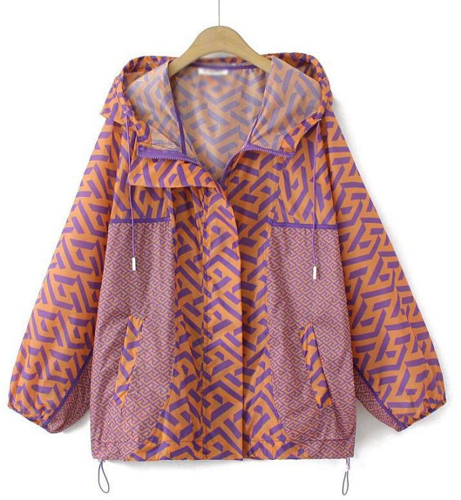 優寶購物《ubao.Tw》特貨品商城,黑貓宅配,取貨付款,女人衣櫥㊕春秋裝小資歐美版型 橘底紫色幾何線條圖案 連帽垂帶側口袋臀長薄款拉鍊風衣外套 胖MM大尺碼超大胸126-156.H247♥ | Yahoo拍賣