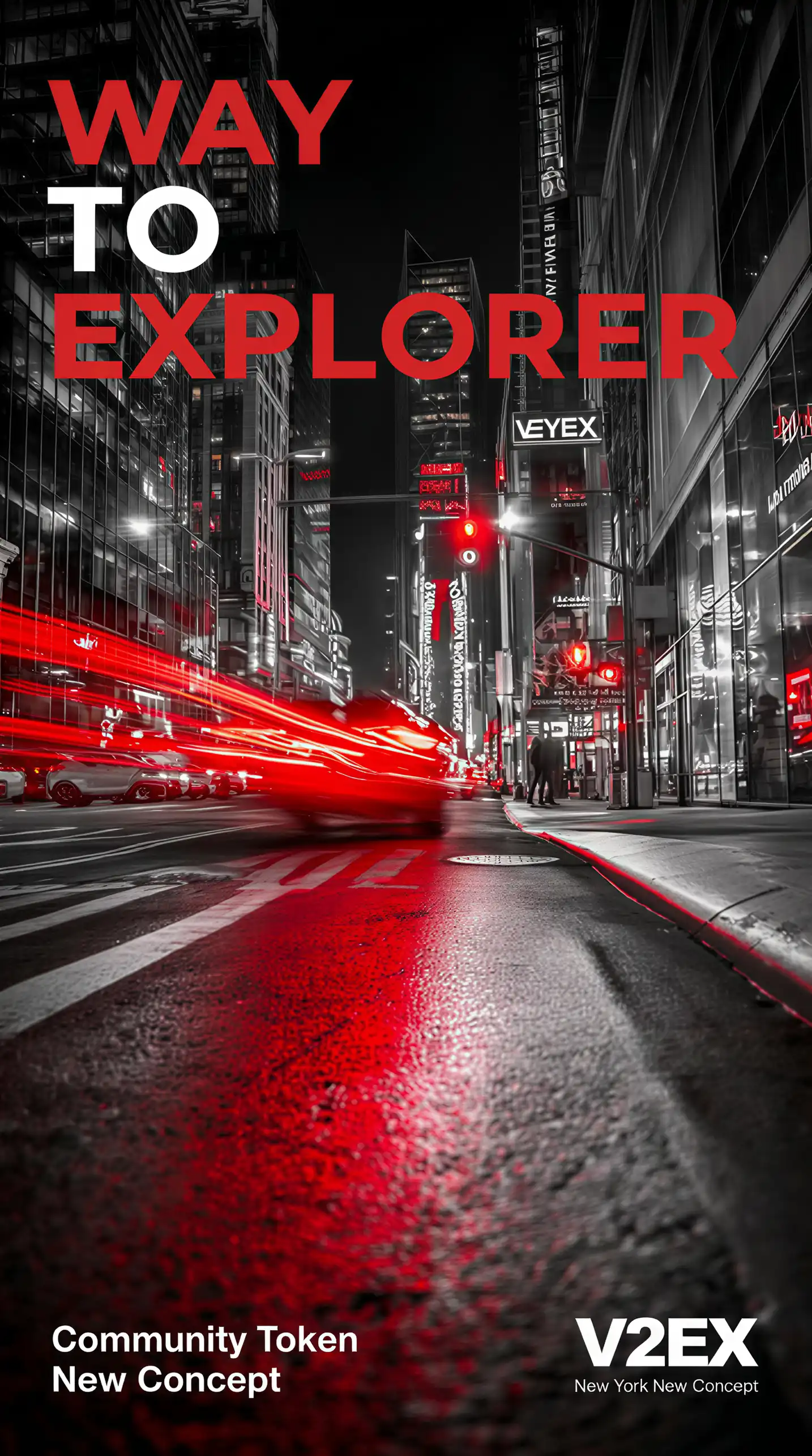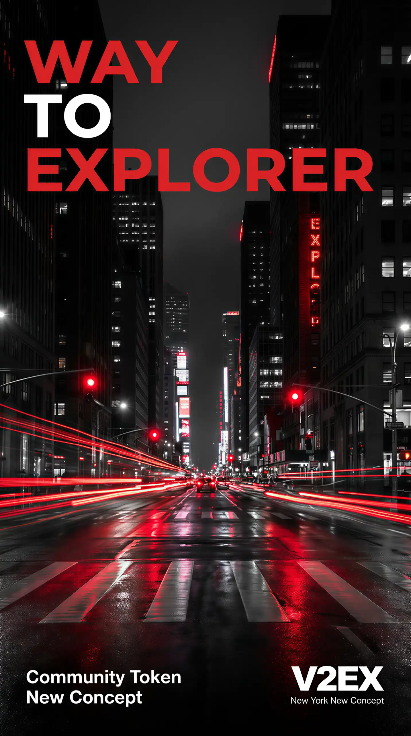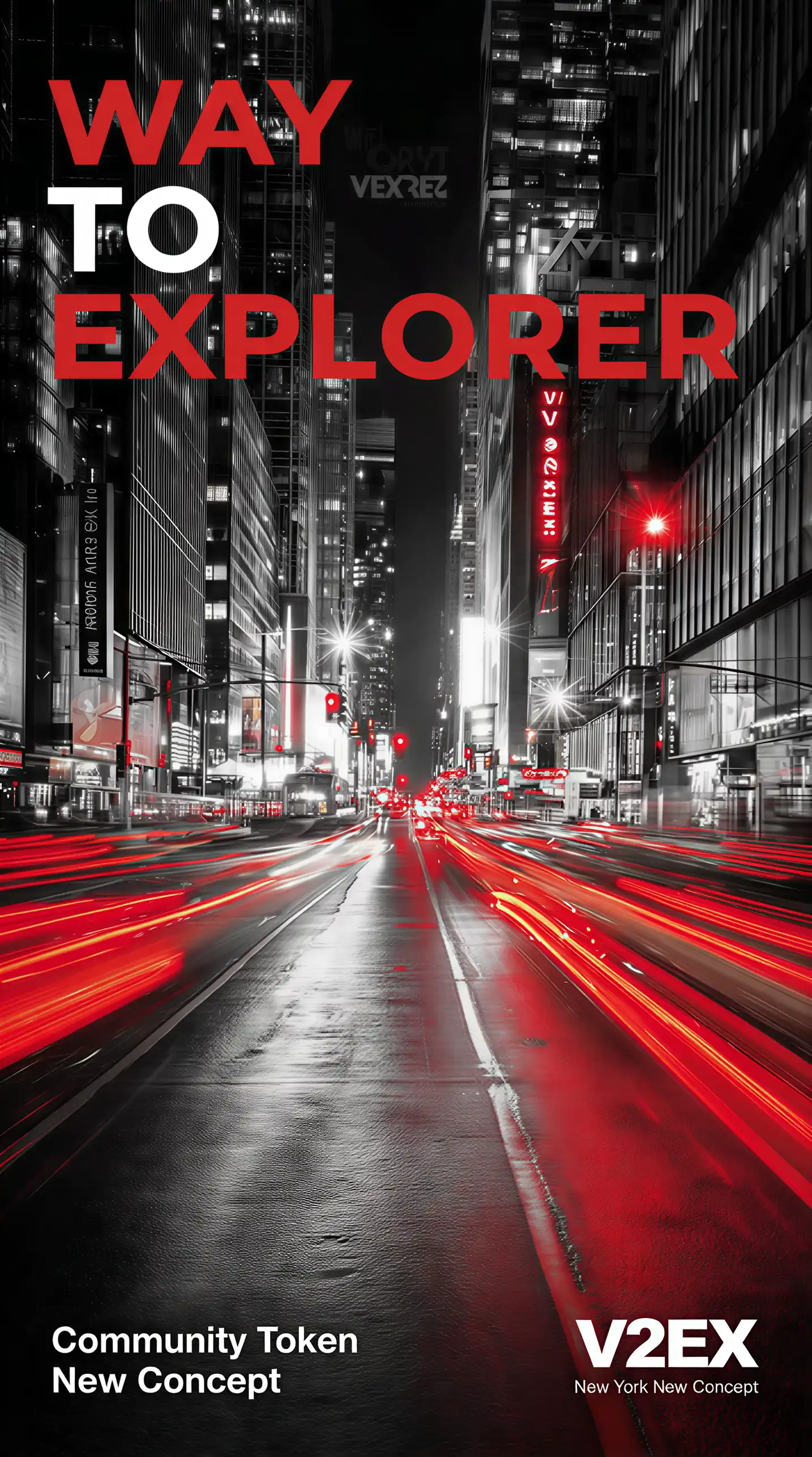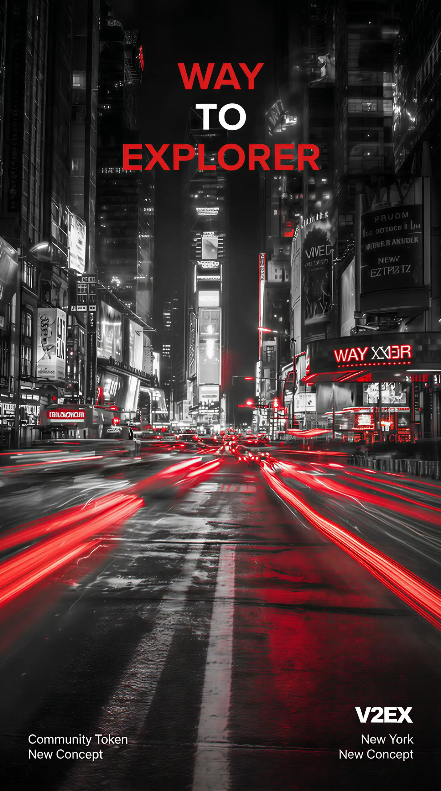 融合成连贯的 2000 年代麦哈顿城市场景:\n- 图片 2:建筑元素和街景细节\n- 图片 3:红色光轨和交通灯\n- 图片 4:湿润路面和反射\n- 图片 5:深色建筑背景\n\n 创建戏剧性的长曝光摄影风格场景,有湿润路面、红色车灯光轨和城市建筑。在合成背景上叠加图片 1 的文字:顶部"WAY TO EXPLORER"(WAY 红色,TO 白色,EXPLORER 红色),左下角"Community Token New Concept",右下角"V2EX"品牌标识配"New York New Concept"