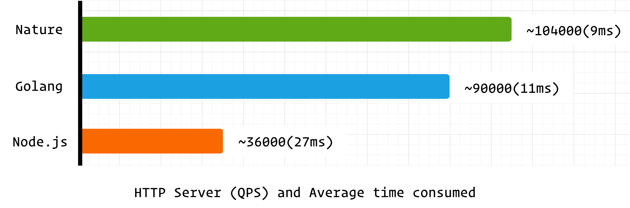 由于 nature 和 node.js 均使用 libuv 作为 IO 后端,所以 node.js 也参与到基准测试中(libuv 线程不安全,node.js 和 nature 的事件循环均在单线程中运行),但 nature 作为编译型语言其并发处理能力远胜过 node.js 。