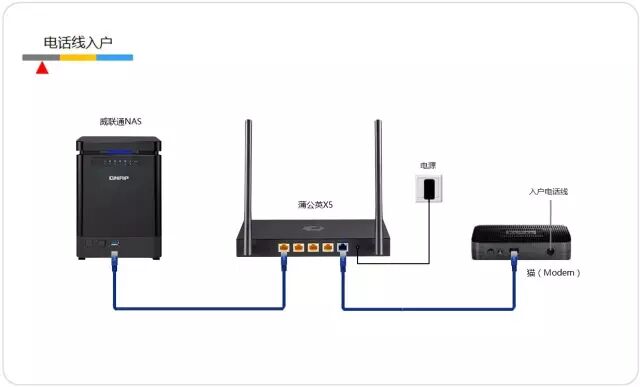 1 、首先是接线,这个也是非常简单,拨号网线接到蒲公英 X5 路由器的 WAN 口,威联通 NAS 接上 LAN 口,最后是电源。