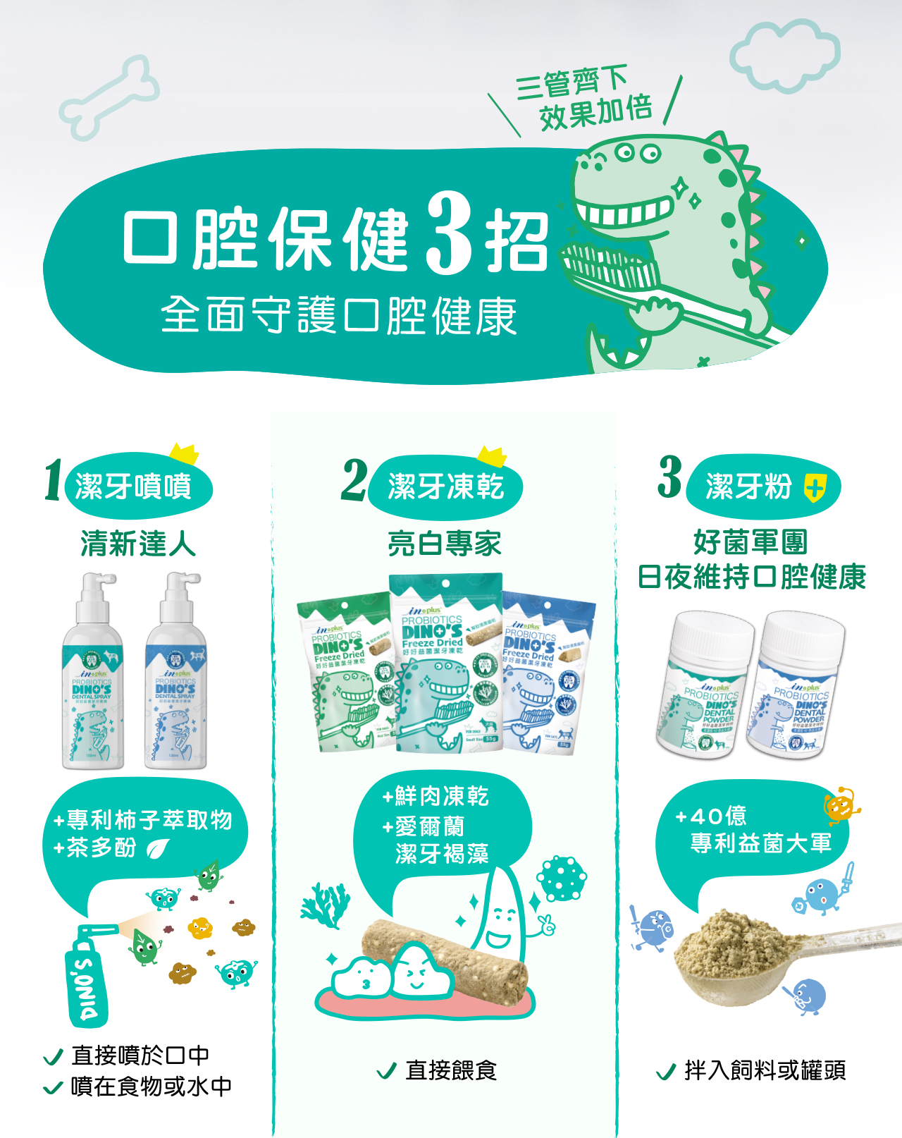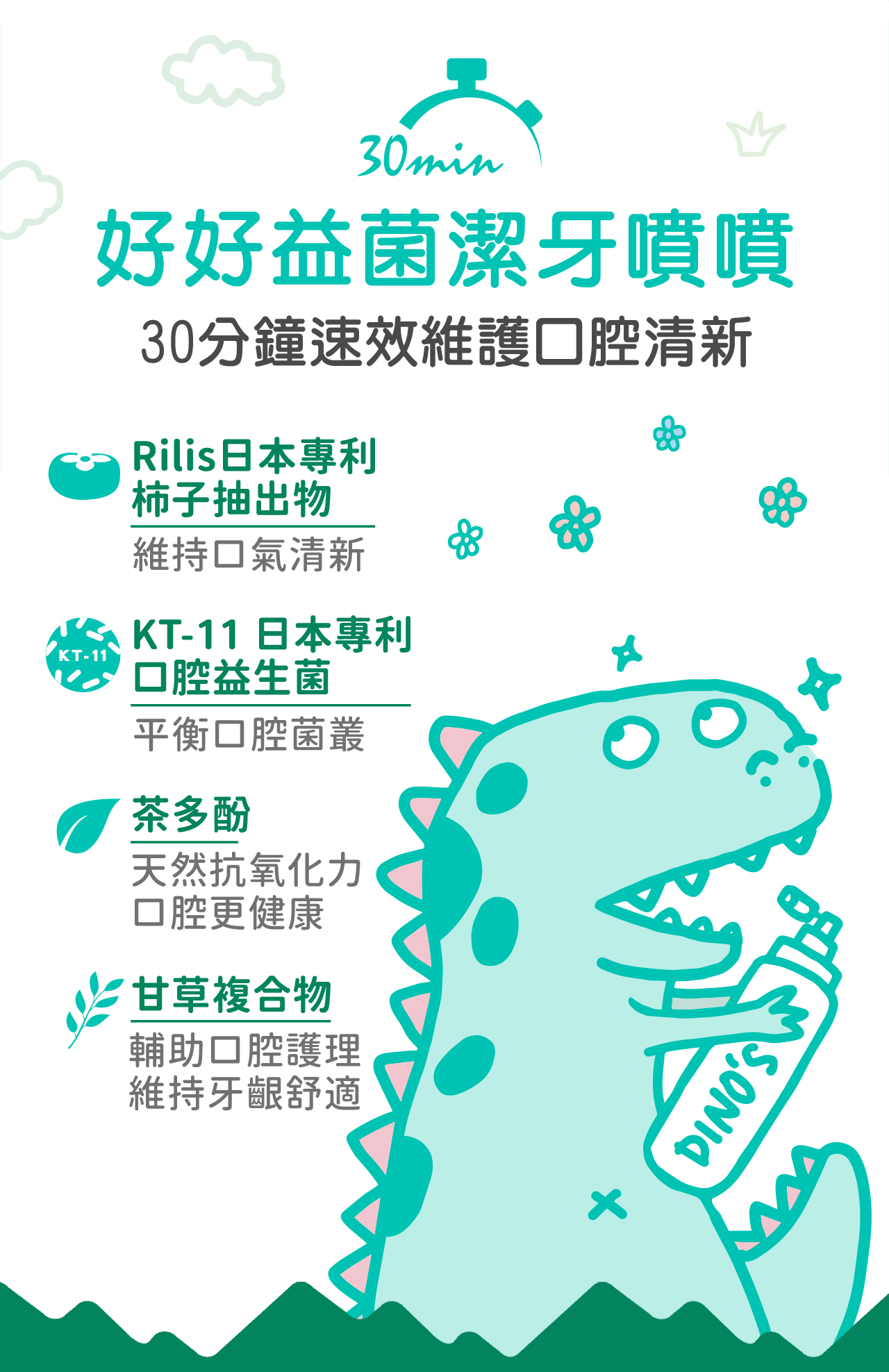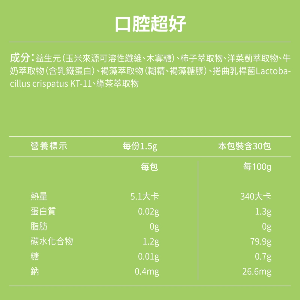 添加日本口腔黃金3配方:KT-11專利菌,維持口腔清新好口氣;專利柿子單寧,清除90%以上口腔異味;乳鐵蛋白,幫助維持口腔保護力!