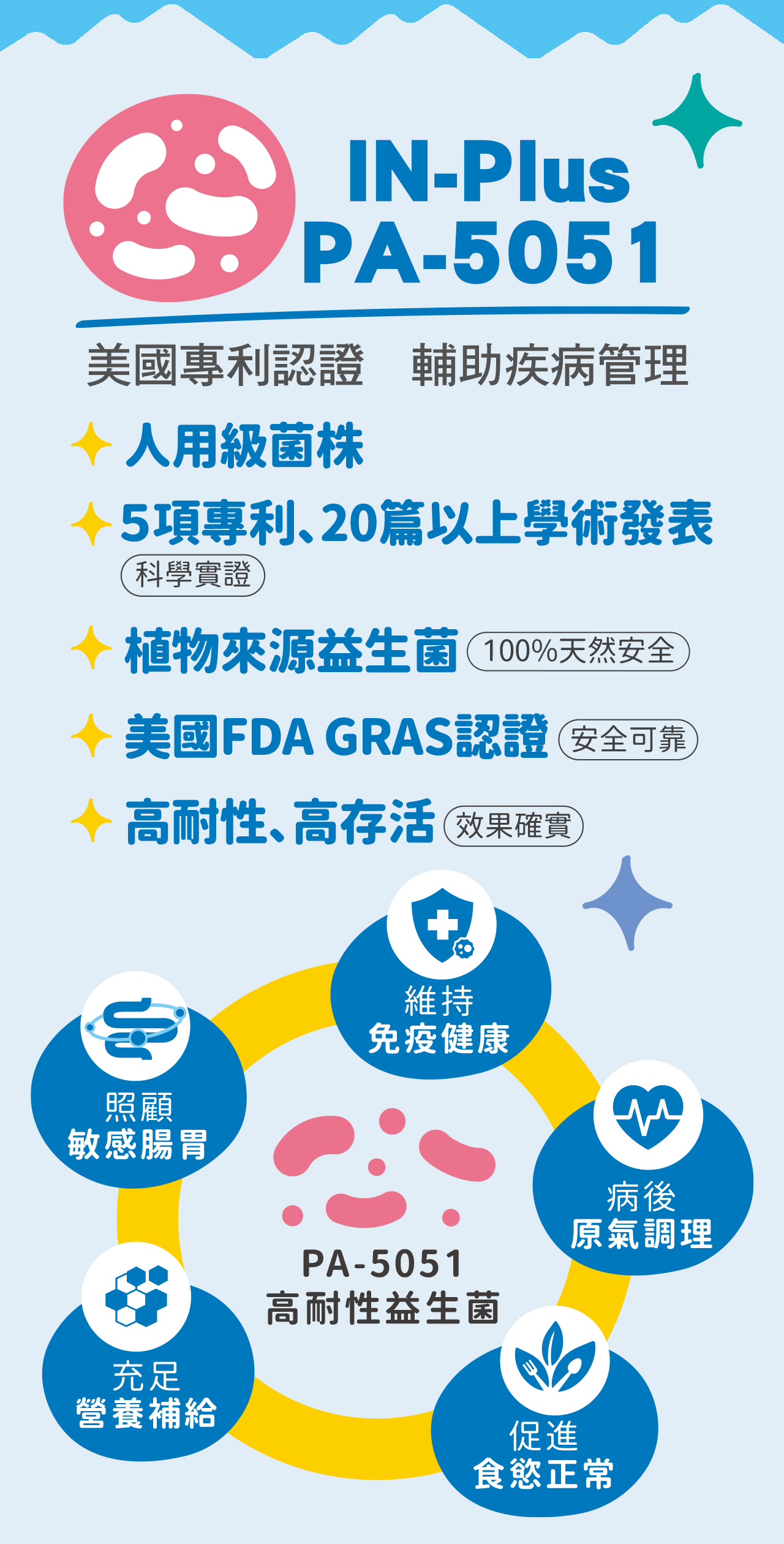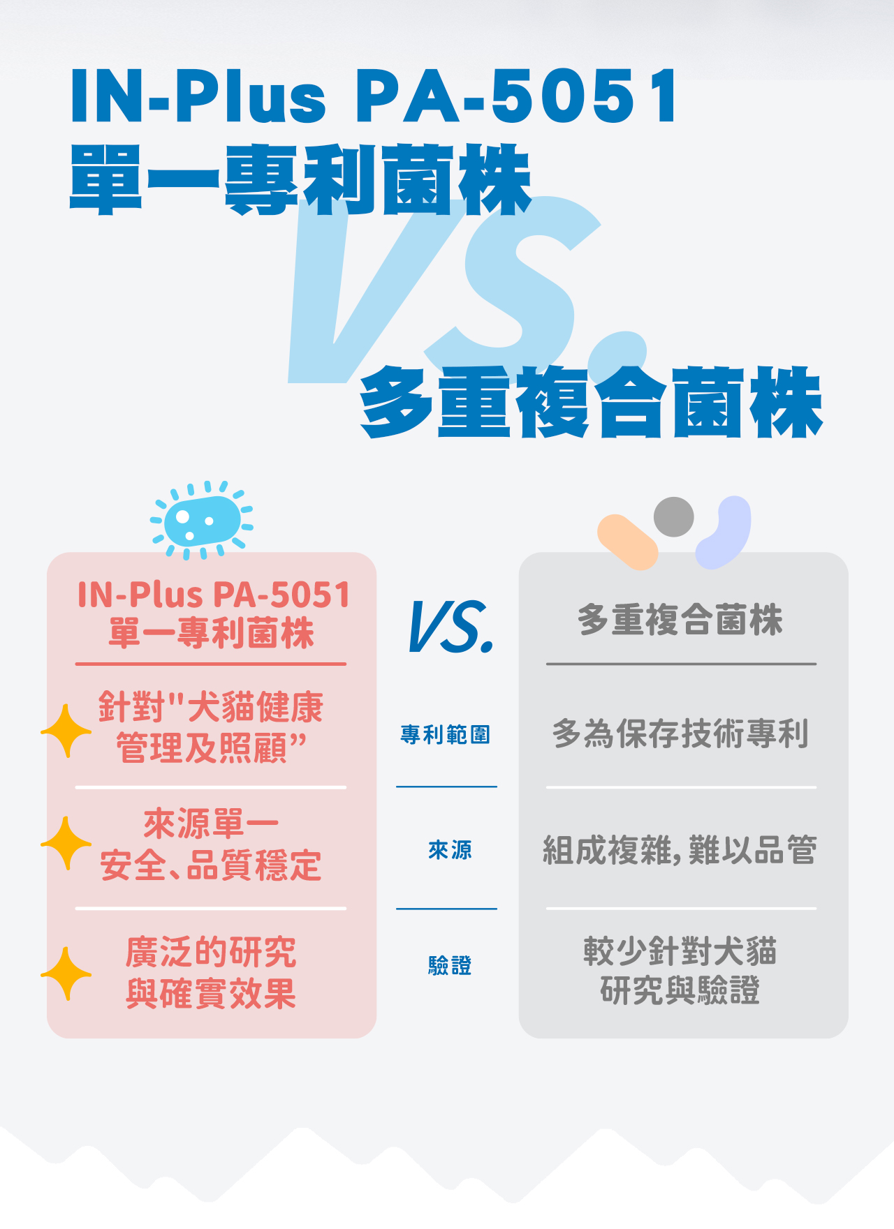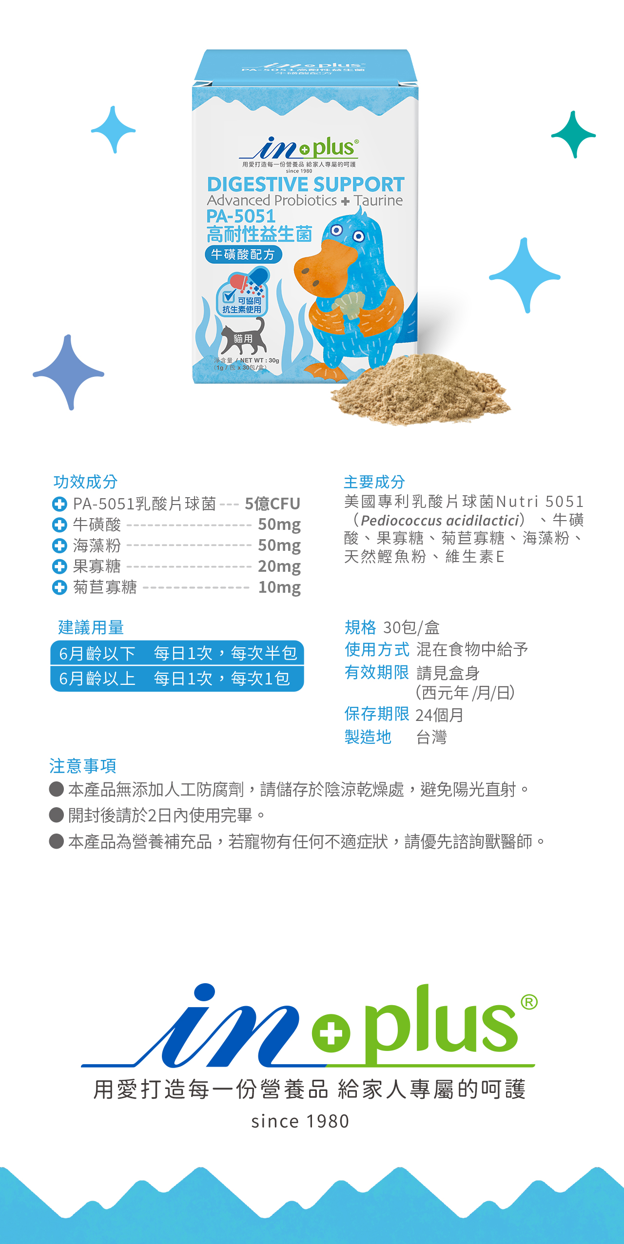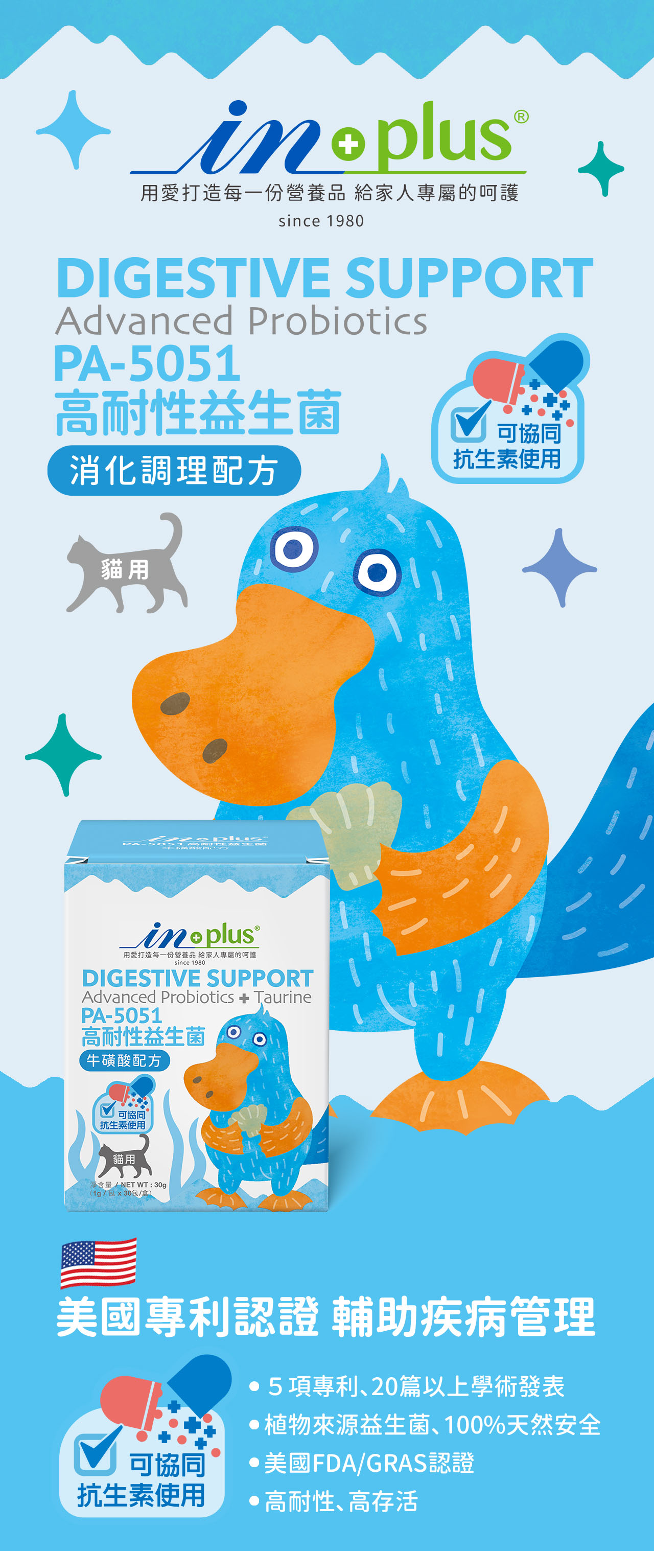 IN-Plus PA-5051貓咪專利益生菌,幫助腸胃消化、加強保健、補充腸道益生菌,並經科學實證證實,具有耐高溫、耐胃酸特性,可協同抗生素使用。使用的是人用專利菌,植物性來源安全。幫助維持寵物消化道健康。