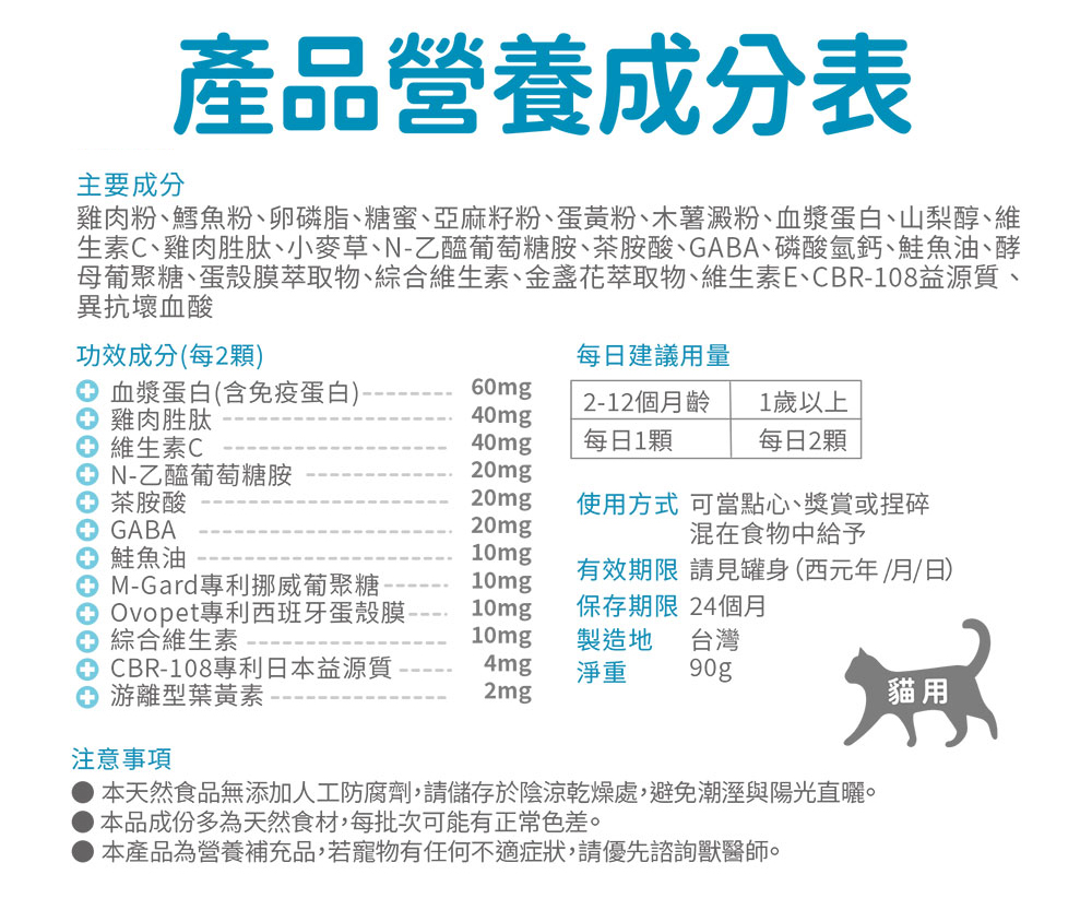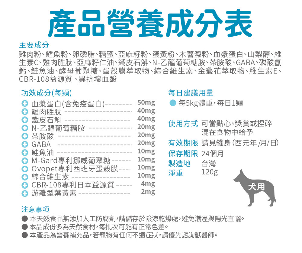 注意事項:本產品為營養補充品,若寵物有任何不適症狀,請優先諮詢獸醫師