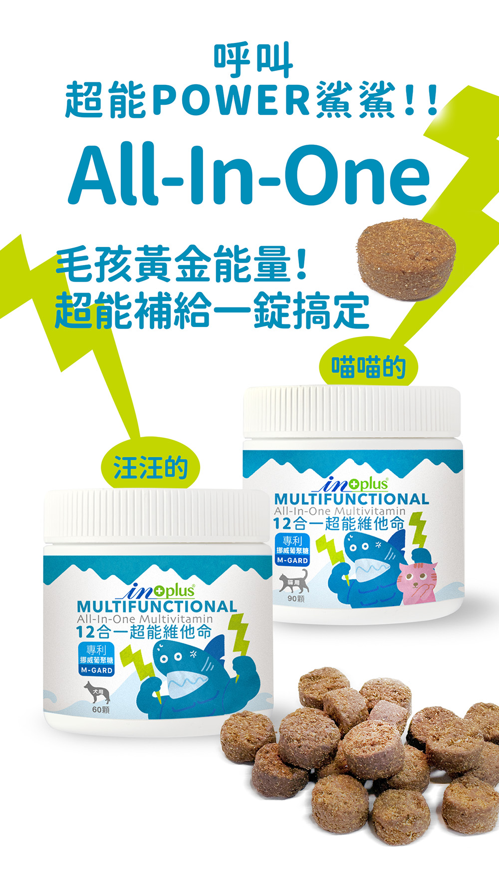 In-Plus完整型機能魚油嚼錠─貓咪專用配方,對毛髮、心臟、關節有完整機能健康維持。添加Ovopet西班牙專利蛋殼膜,科學實證,可以維持關節舒適;挪威鮭魚油則能幫助照護皮膚敏感;CoQ10維持心臟健康。雞肉軟嚼錠形式,好餵食、適口性佳,低敏無穀配方,使用人用級原料,餵食更安心。