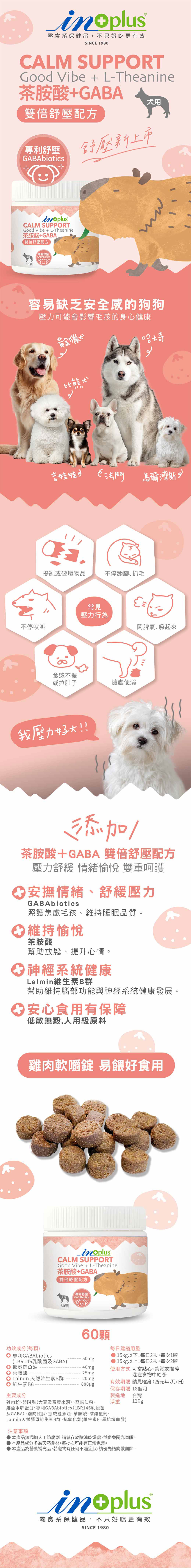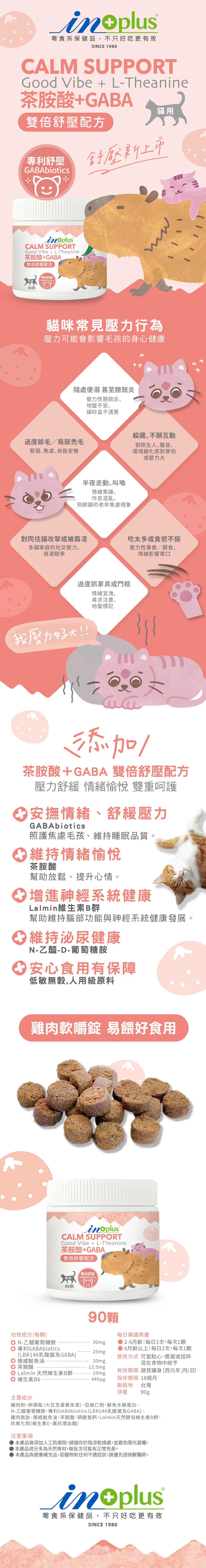 IN-Plus 雙倍舒壓錠則融合天然茶胺酸與專利GABA,幫助毛孩在面對環境刺激(如雷聲、煙火、獨處分離)時,維持穩定情緒與放鬆狀態,陪伴牠從容度過日常中的大小壓力。貓咪款額外添加N-乙醯-D-葡萄糖胺,呵護貓咪的下泌尿道黏膜健康。