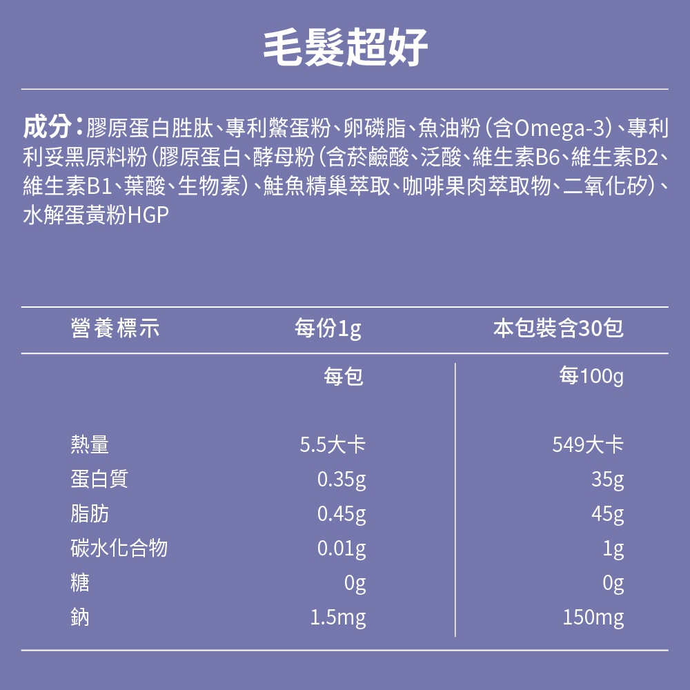 專利鱉蛋粉X專利HGP水解蛋黃粉,維持毛髮健康茂密;精選6大靚毛配方搭配魚油粉,維持毛色亮麗。專利成分X世界大廠製作,安心有保證