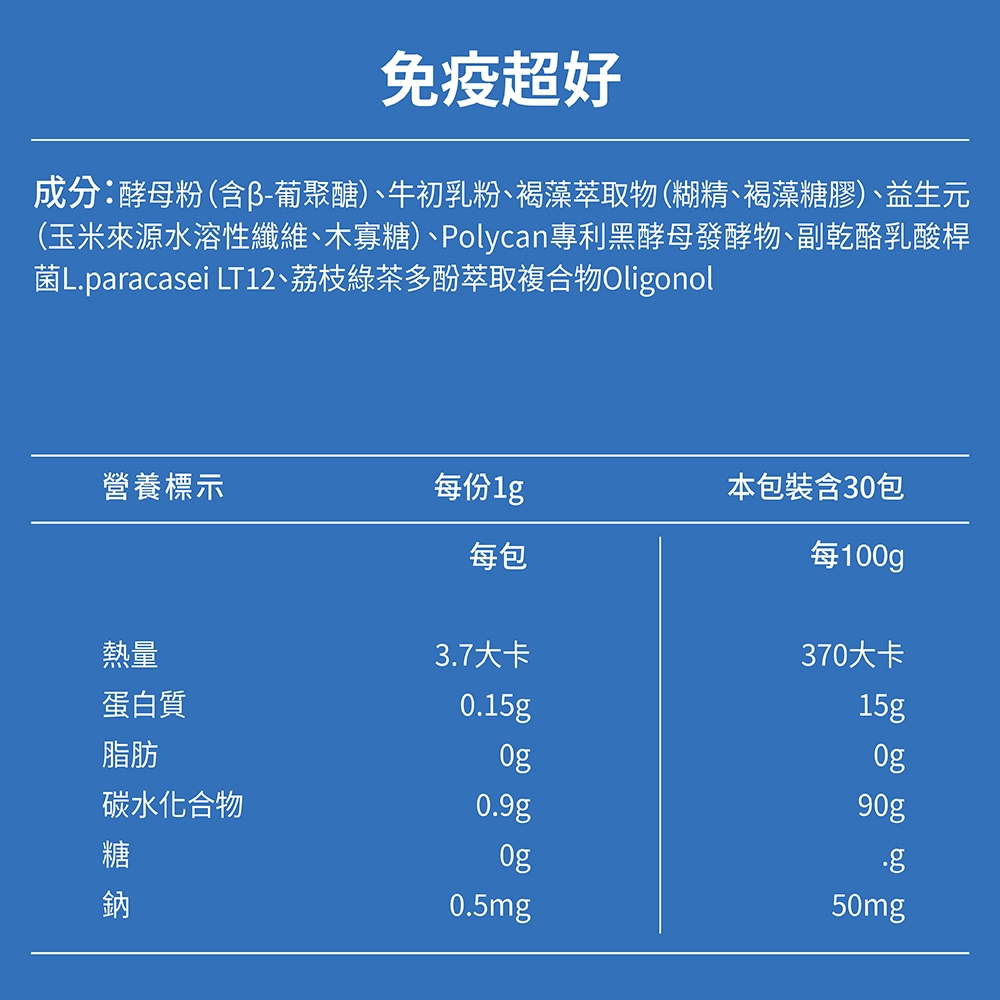 多國專利配方打底:黑酵母、葡聚糖、LT12益生菌,由內而外維持免疫力與抵抗力。高活性褐藻醣膠及初乳蛋白,保持健康好活力!