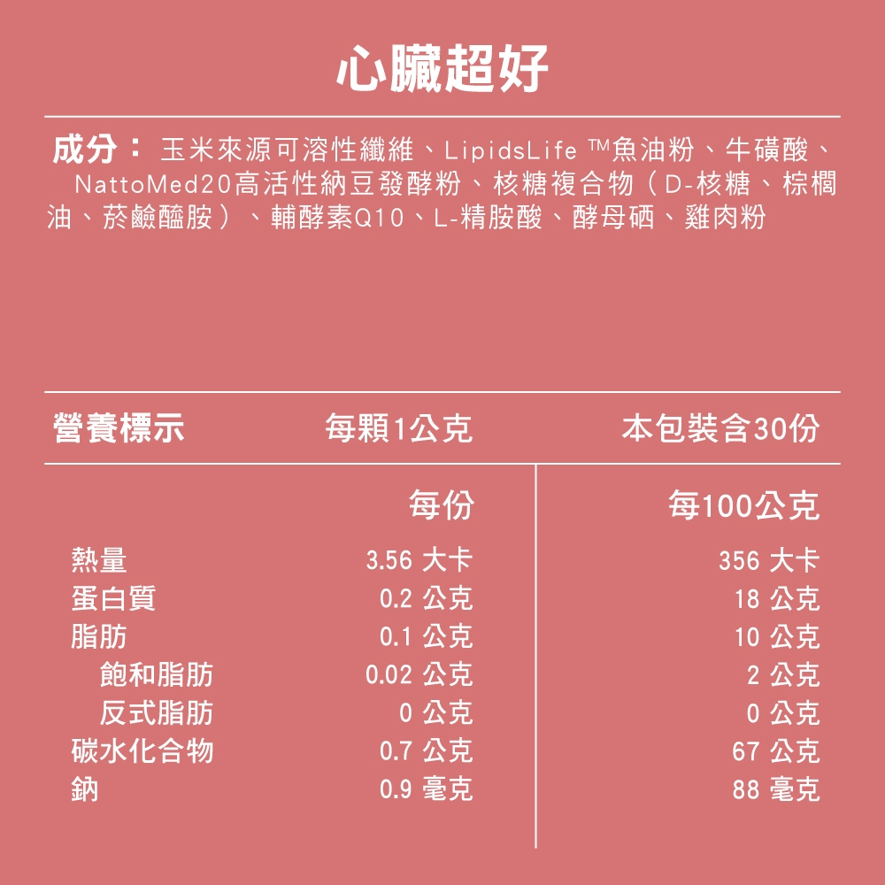 專利納豆激酶具高活性,保持心血管暢通,搭配共具9項國際專利護心素-日本專利Q10,維持心臟功能。添加專利核糖複合物,為貓狗的活力續航不間斷
