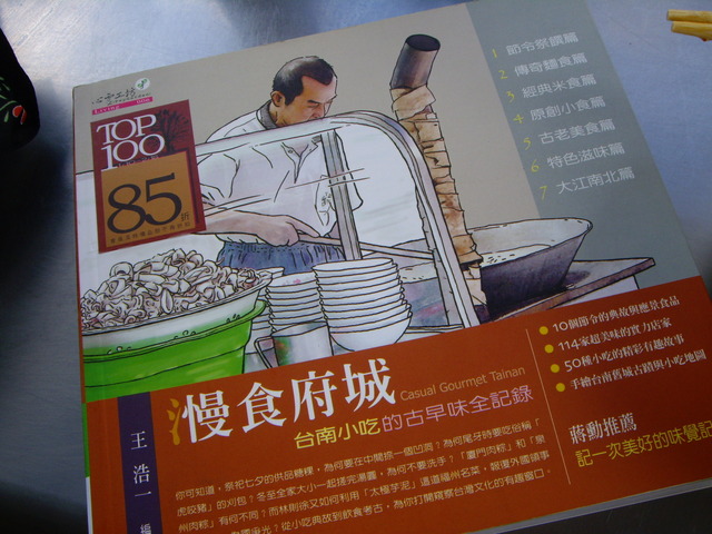 我同事C.人.行李薄短小.背著小背包就上路了~是夏天旅行的好.最重的"行李"是本此行用的工具"慢食府城-台南小吃的古早味全".是我已久的珍藏.全彩板印刷.是我的偶像,台南城市作家.文史工作者--王浩一的大作.後有附一面印刷的摺美食小吃.我地都不用了~到了台南.就可以按索吃遍美食!