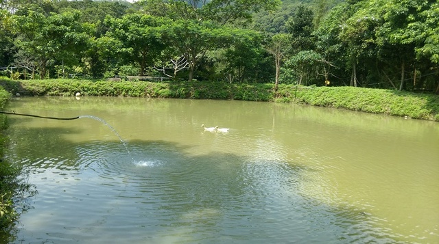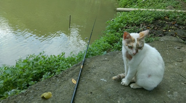 在六妹夫塘垂,小咪在旁守候等著吃!