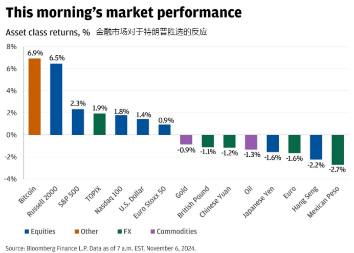 金融市了美大埃落定後的」走「--川普行情再次盛行。昨日消息公後,美股指期即大幅走高,道指期超3%,普500指期超2%,斯克100指期近2%。美元指大1.9%,破105卡。金一度跌超2%,白一度跌逾4%。不波走可以持多久,是接下需要注的。
