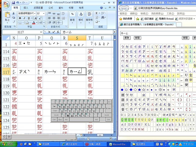 最近在整、入「守台注音」,由於人不程式,也只能模彷《教育部典》首的「注音表」,弄了符合自己使用的「文注音符入表」,一字符、一字符的入,然後,到Excel的存格——
