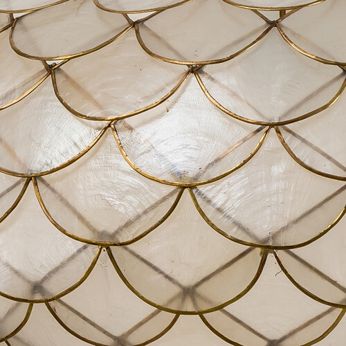 瑜恩工作室新作品所用的材料是卡皮(母蛤,Capiz-Shell),在菲律的佬沃和碧之的干(Vigan,又美岸)古老西班牙街屋拿此放在窗框中光片,以往中一些古老建的窗或屋也用此”海月”可透光的做「窗」或「明瓦」。邸舍因它而高,雅舍有它更珍,寒舍因它而可。呀!水中望月影漪,海市蜃成,看花迷,法人人自有巧妙不同,巧得很真又幸遇上了。