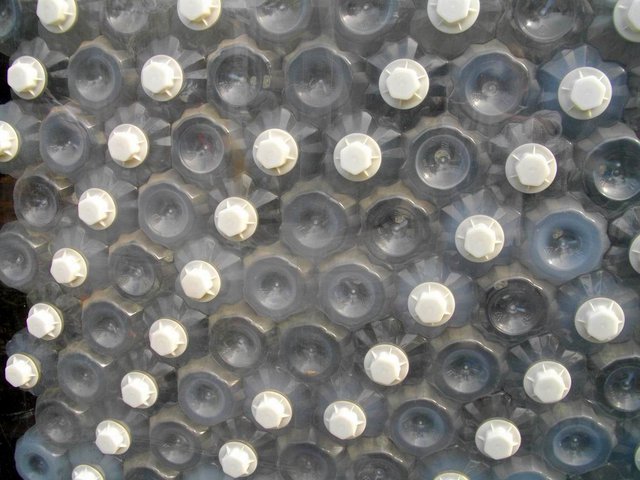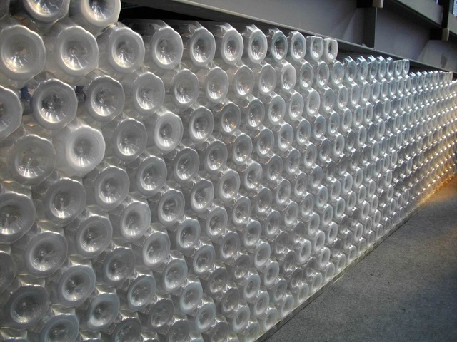 特瓶以六角形方式互相嵌接,都是用各地回收的各式特瓶熔化之後,重新塑模造,既省物料源成本,又符合保再生概念,如此智慧,真是咱同胞的傲