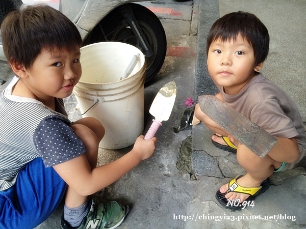 陪在家的可立正在忙做土水。