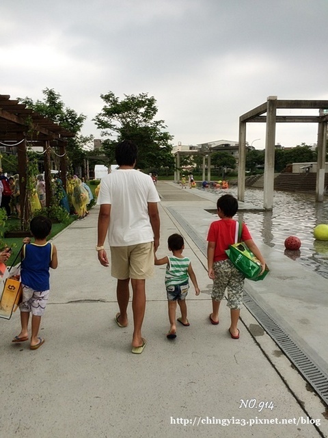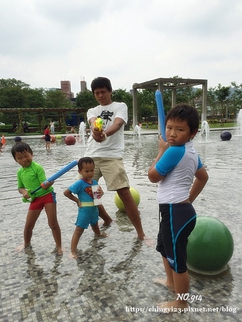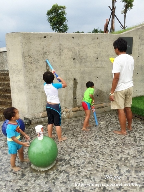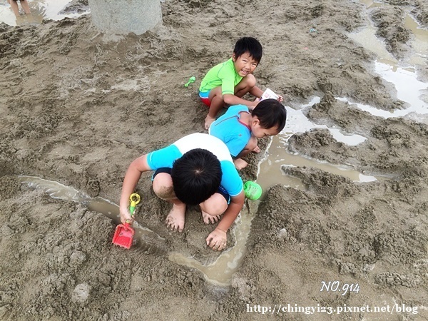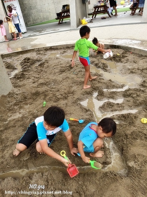 沙坑玩完,洗掉身上的泥沙之後就可以入水池了。