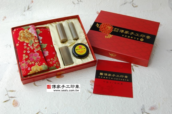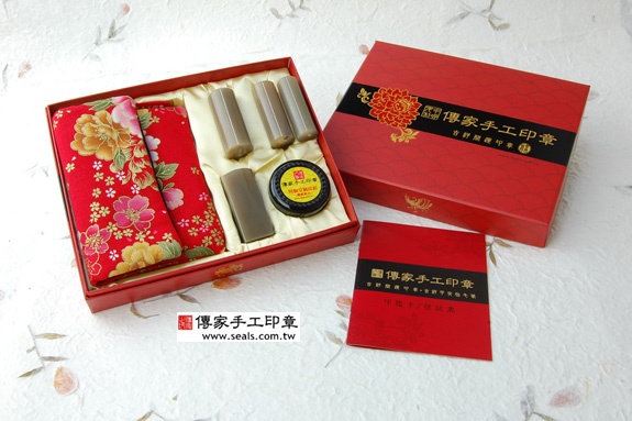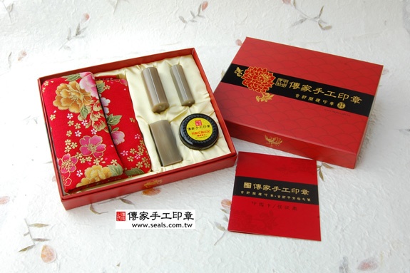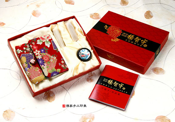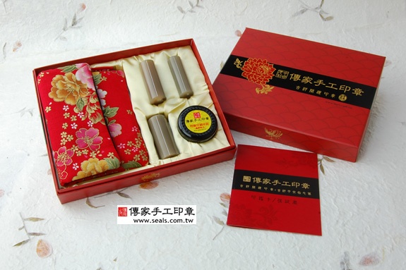 2. 家手工印章━「赤牛角日本/印章的成品」。包含:赤牛角日本/印章、全手工印章外出袋、印泥、家手工印章的保、精美中的印章外盒(印盒有四大水神:左青、右白虎、前朱雀、後玄武)。