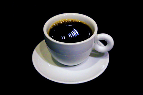 一杯在地震中的暗室用有著形把的白瓷杯盛且微的肯阿拉比卡黑咖啡(37元)