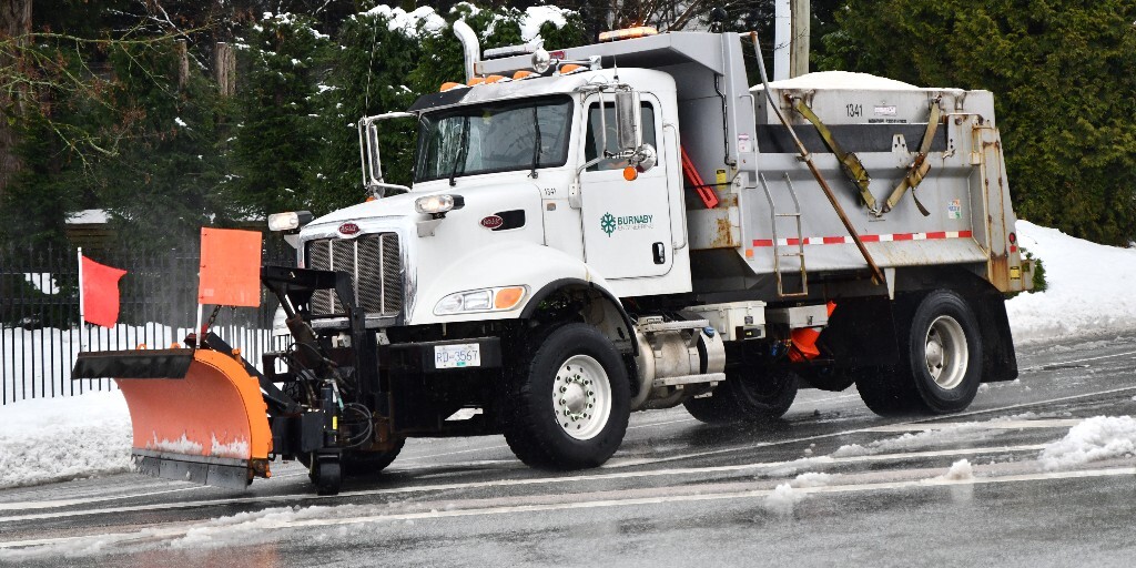 本那比市雪在除雪中,後面斗的是雪,前面推雪,後面一路走一路撒在路面,防止雪冰。