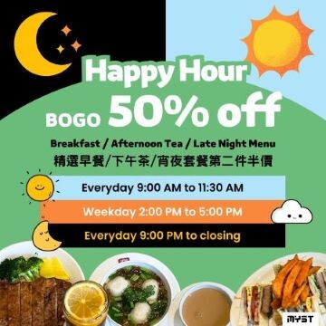 家店有 Happy Hour 早餐特,第二套打五折待,於是大夥乎都了早餐。只有影人和她夫婿不同,她出吃,然要吃好的,他看高的,比好吃。