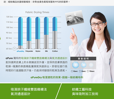 2.aPureDry吸速乾科技面料:能效保持乾爽,快速排出汗水,臭味既法生也附著不上去