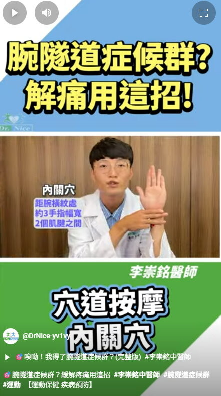 向大家介又的李崇中,目前在Dr.Nice()新中大家服,健身的他,要跟大家分享,很多人都碰到的腕隧道症候群。