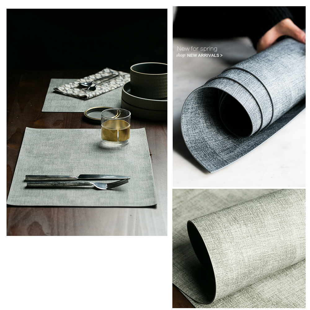 本款餐以PU皮主要材料,耐、耐磨、防水、防油、防污、防滑、抗菌。放在桌面上杯子、餐具等,可防止餐桌打滑、面,同又兼具美。大方、素高雅,亦可放在花瓶、灰缸下做托。