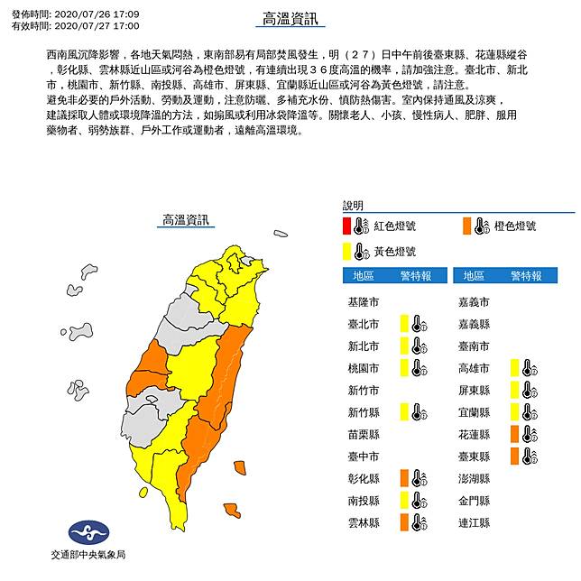 今日全台高分布,12市都出高警。 :中央象局/提供