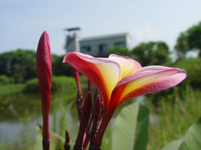 第一朵粉蛋花,得好大,好,直挺挺立在最高枝迎著我。