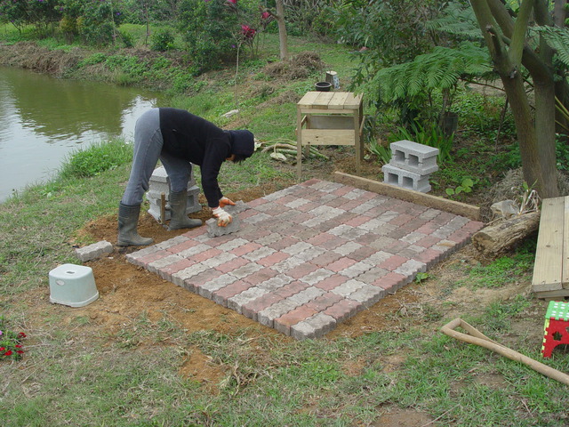 得的大型水泥板、中型水泥和白色的地,前面在一次工程中完全用光光,一也剩下,用湖小之後,倒剩了一小堆,於是砂子用了分批推,在皮屋正略略靠右一草皮的小空地上,出了一平台。