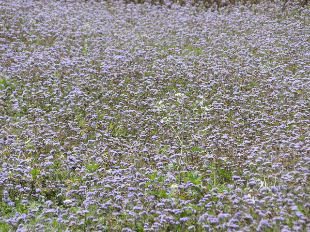 春,白石的休耕田紫色的霍香花,形成一匹接一匹限展的巨毯,植物乎全年花,春天得最也最密,春天是於紫花藿香的季。